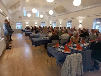 Fællesspisningen den 23. september 2022 i Ellinge Forsamlingshus blev afviklet med en fejring af Forsamlingshusets 125-års fødselsdag samt Trines 3 års virke som vært i huset.