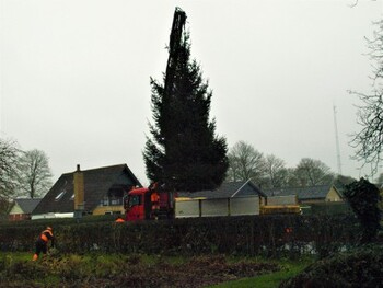 Tirsdag, klokken havde ikke passeret 10 om formiddagen, var Nyborg Kommune i gang med at fælde Inger's grantræ, og da klokken lige havde passeret 10 var det tilpasset i bunden, og sat på plads på Trekanten.