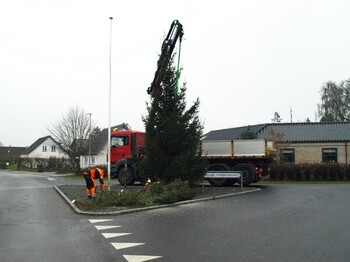 Og så kom Inger til at tænke på, at det jo snart er Jul, og så plejer Nyborg Kommune at komme og sætte et juletræ op på Trekanten i Ellinge, og mon ikke de kunne bruge hendes grantræ?