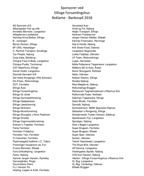 Tak til sponsorer EllingeOffentliggjort af Allan Andersen i Banko · torsdag 29 mar 2018 · Læsetid 1:00 Bestyrelserne for Ellinge Forsamlingshustakker de 89 velvillige firmaer somsponserede de meget fine gevinster.29-03-2018